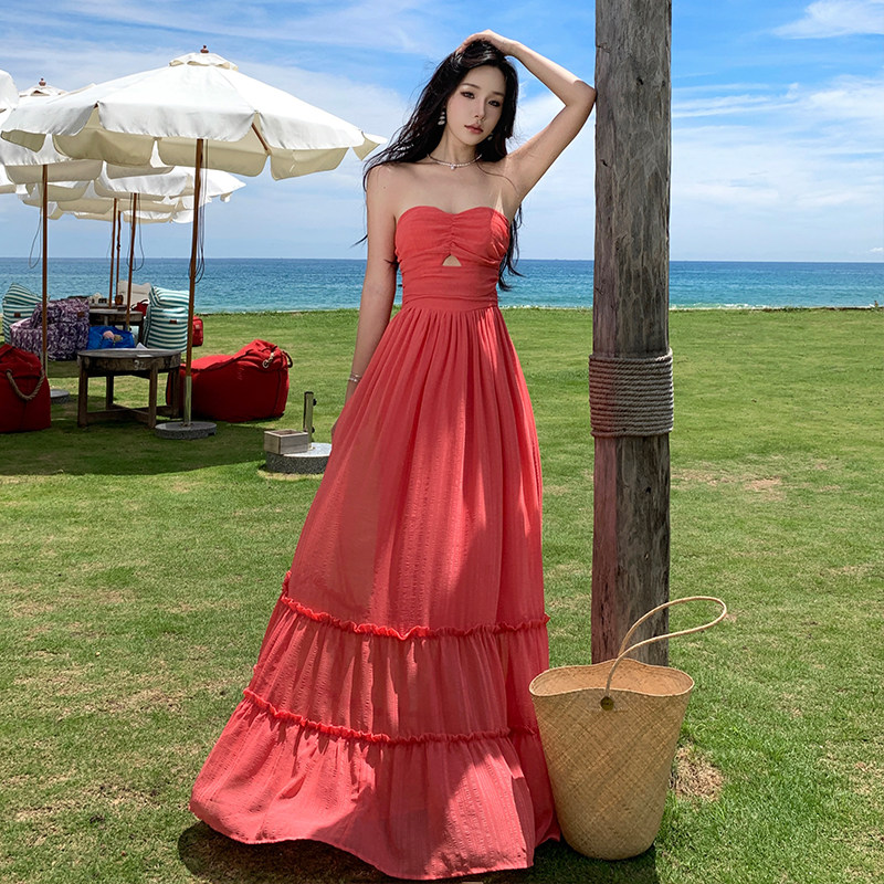 清仓民族风显瘦沙滩裙泰国薄棉长款大摆连衣裙包肩短袖抽带胸仙女