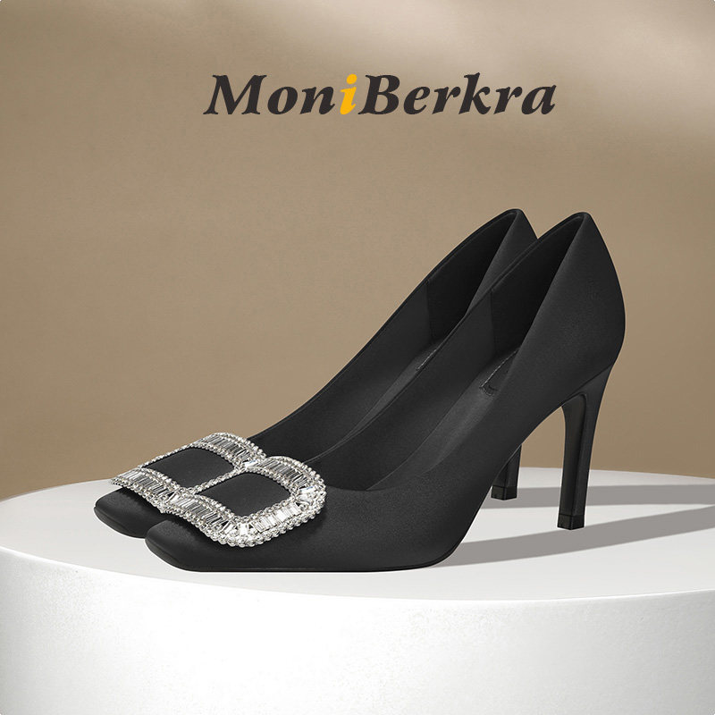 RV水钻方扣高跟鞋女细跟2026年时尚新款真丝绸缎气质百搭方头单鞋