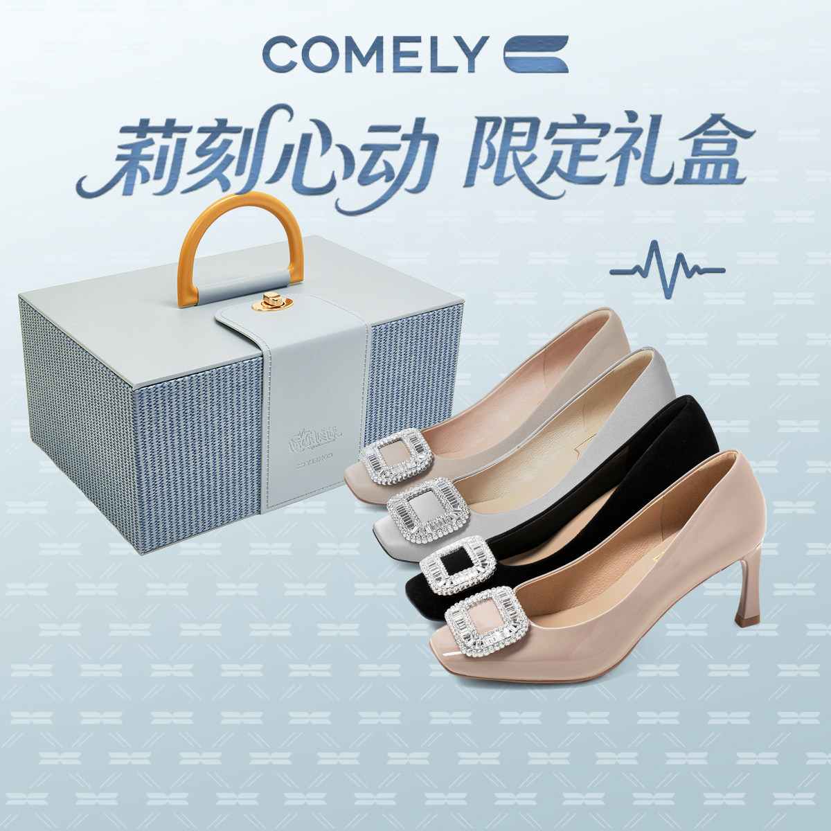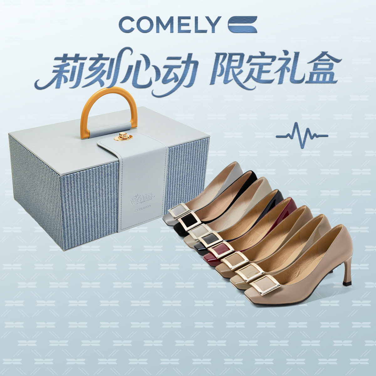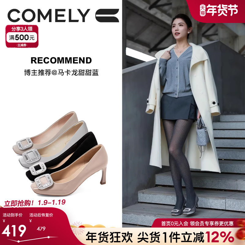 康莉comely牛漆皮细跟方头单鞋女秋新款通勤经典方扣高跟鞋