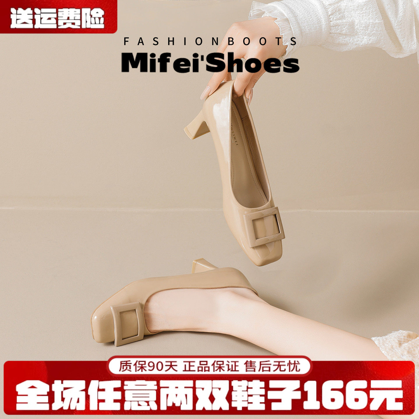 自由姿色25年春秋新款法式方头气质大方扣高跟鞋漆面光泽复古单鞋