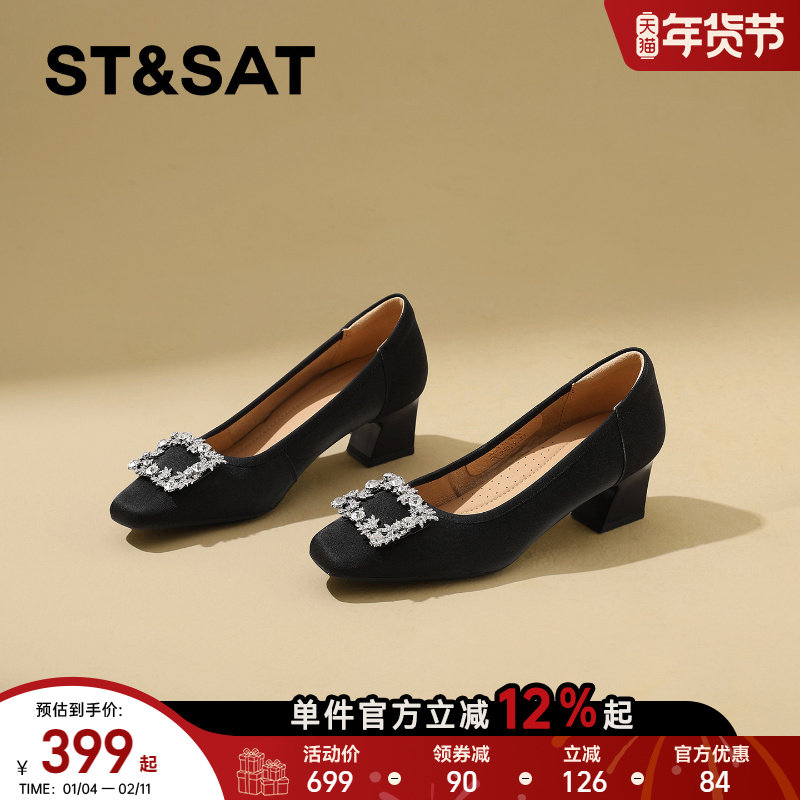 星期六法式优雅方头粗跟浅口单鞋女2026春季新款水钻大方扣高跟鞋
