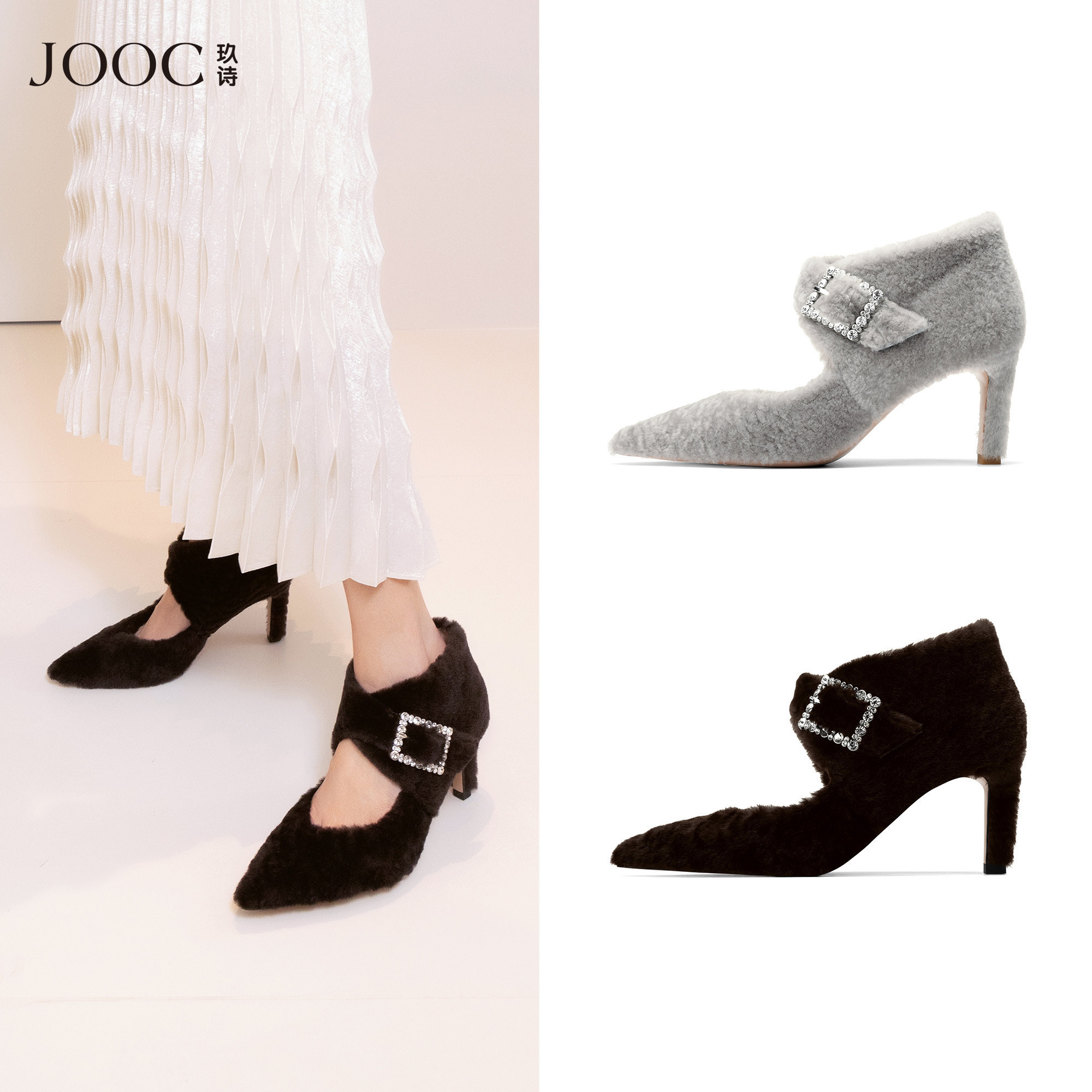 JOOC玖诗细跟增高通勤时装单鞋女2026春季新款尖头水钻方扣高跟鞋