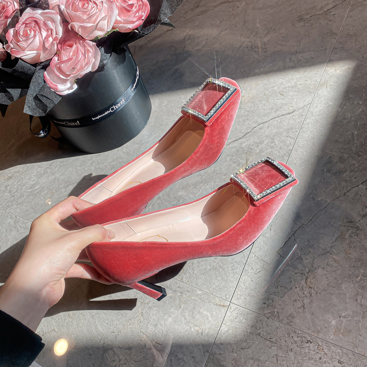 法式新娘鞋2026春夏新款粉色丝绒跟鞋方头水钻方扣高跟鞋气质单鞋