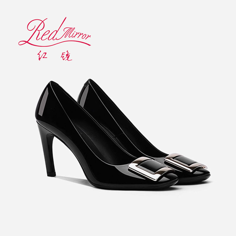 红镜rv方扣高跟鞋2025年新款女方头职业气质方扣细跟浅口羊皮单鞋