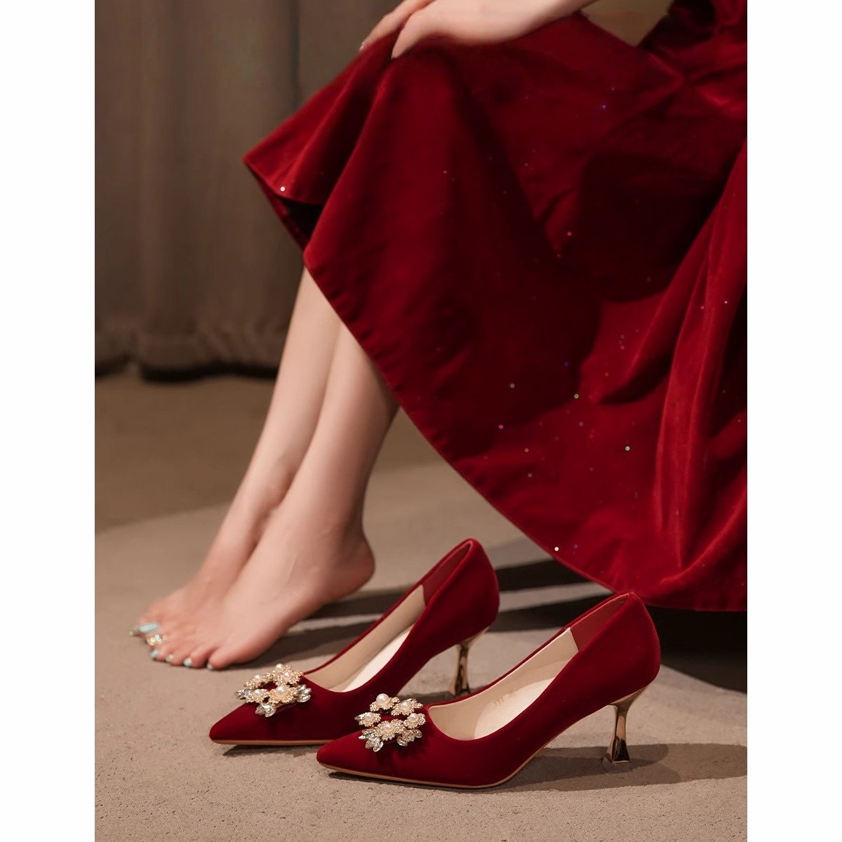 红色婚鞋女中式秀禾服婚纱两穿珍珠方扣高跟鞋不累脚订婚敬酒单鞋