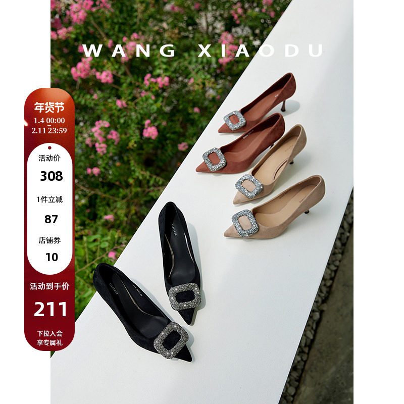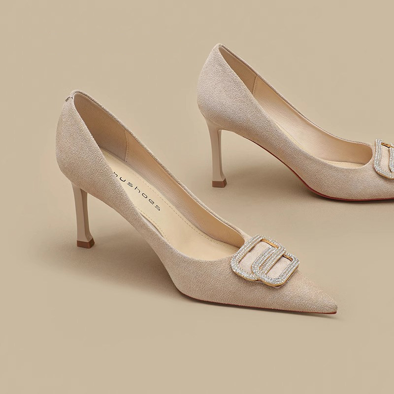 法式气质水钻方扣高跟鞋女2025春夏季新款尖头细跟绒面配裙子单鞋