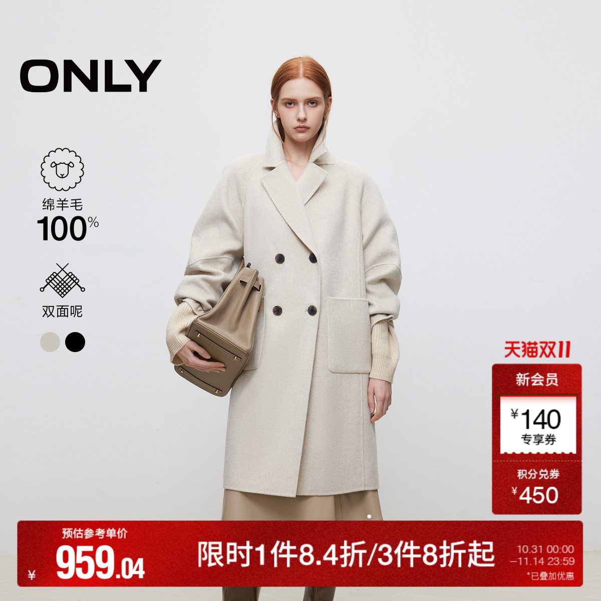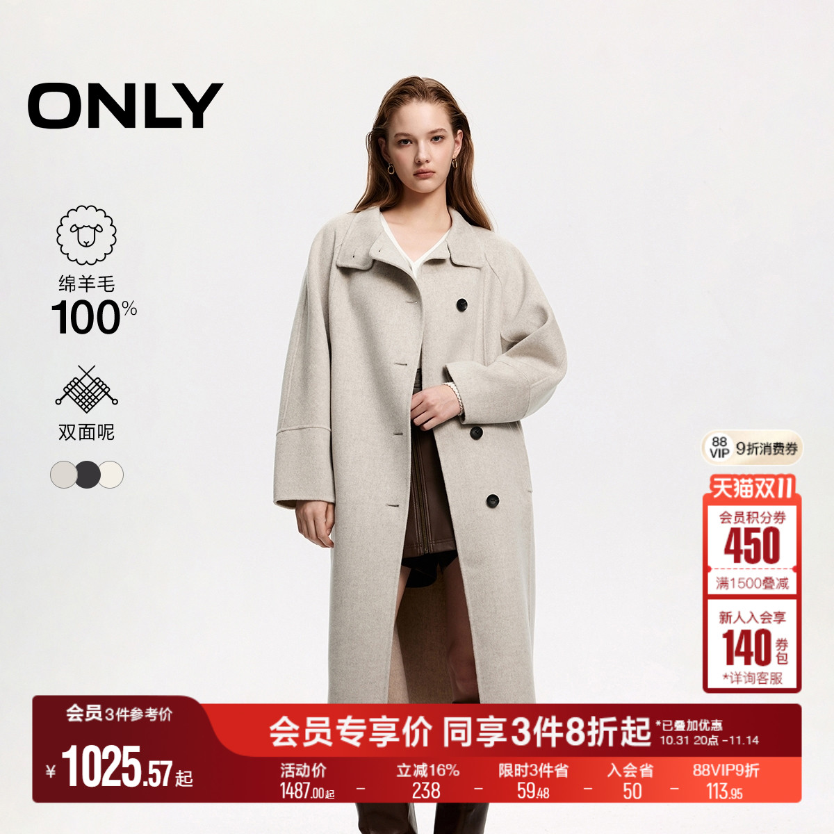 ONLY2025冬季新款100%绵羊毛双面呢纯色双排扣直筒长款毛呢大衣女