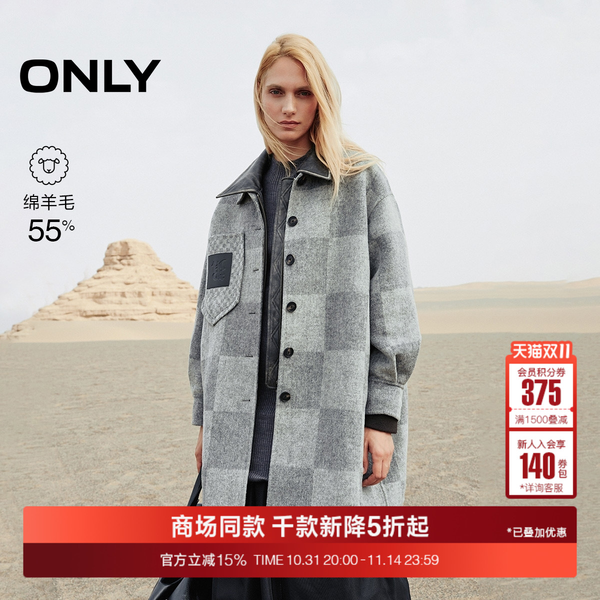 ONLY2025冬季新款宽松落肩棋盘格翻领休闲羊毛混纺廓形毛呢大衣女