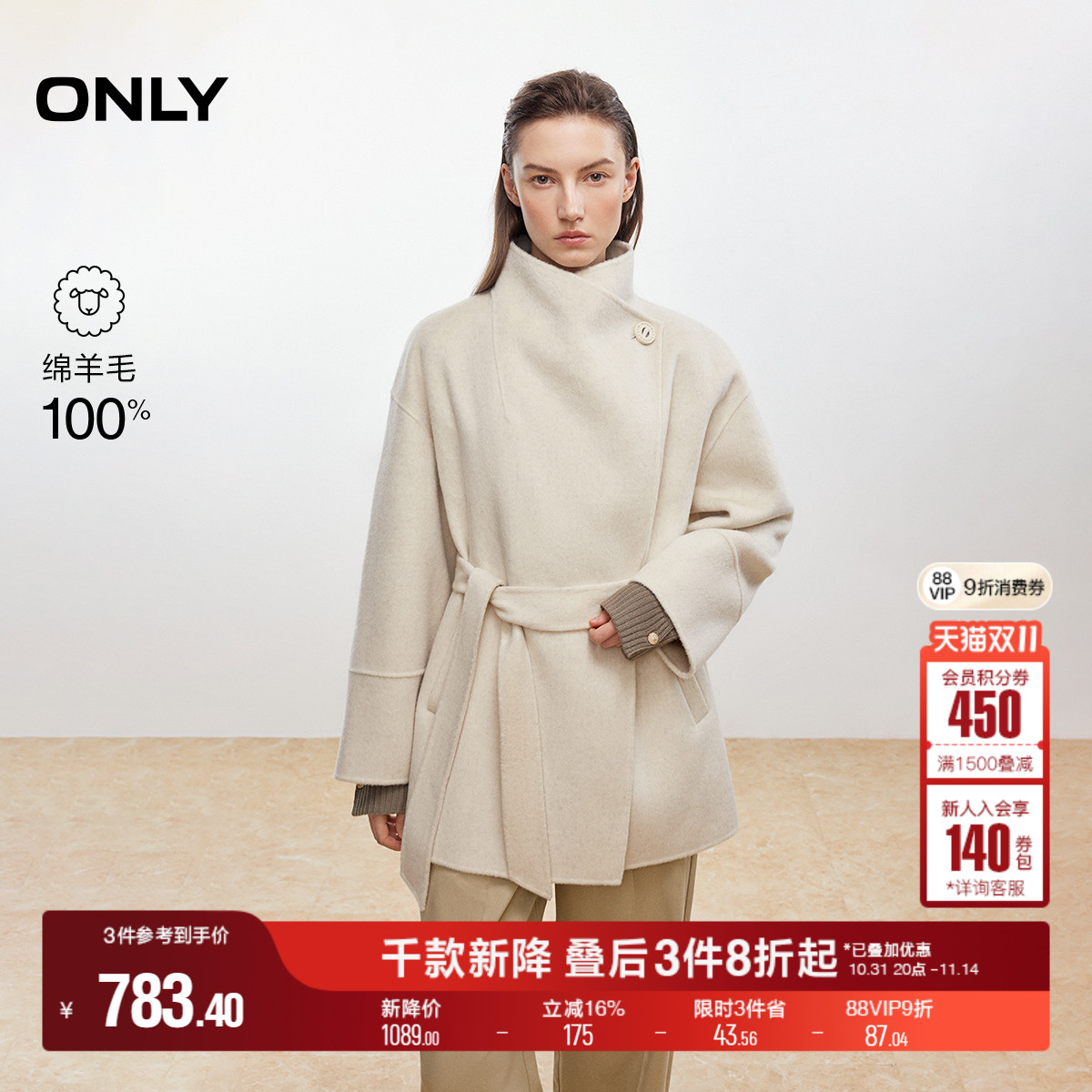 ONLY2025冬季新款立裁宽松收腰腰带舒适中长款绵羊毛毛呢大衣女