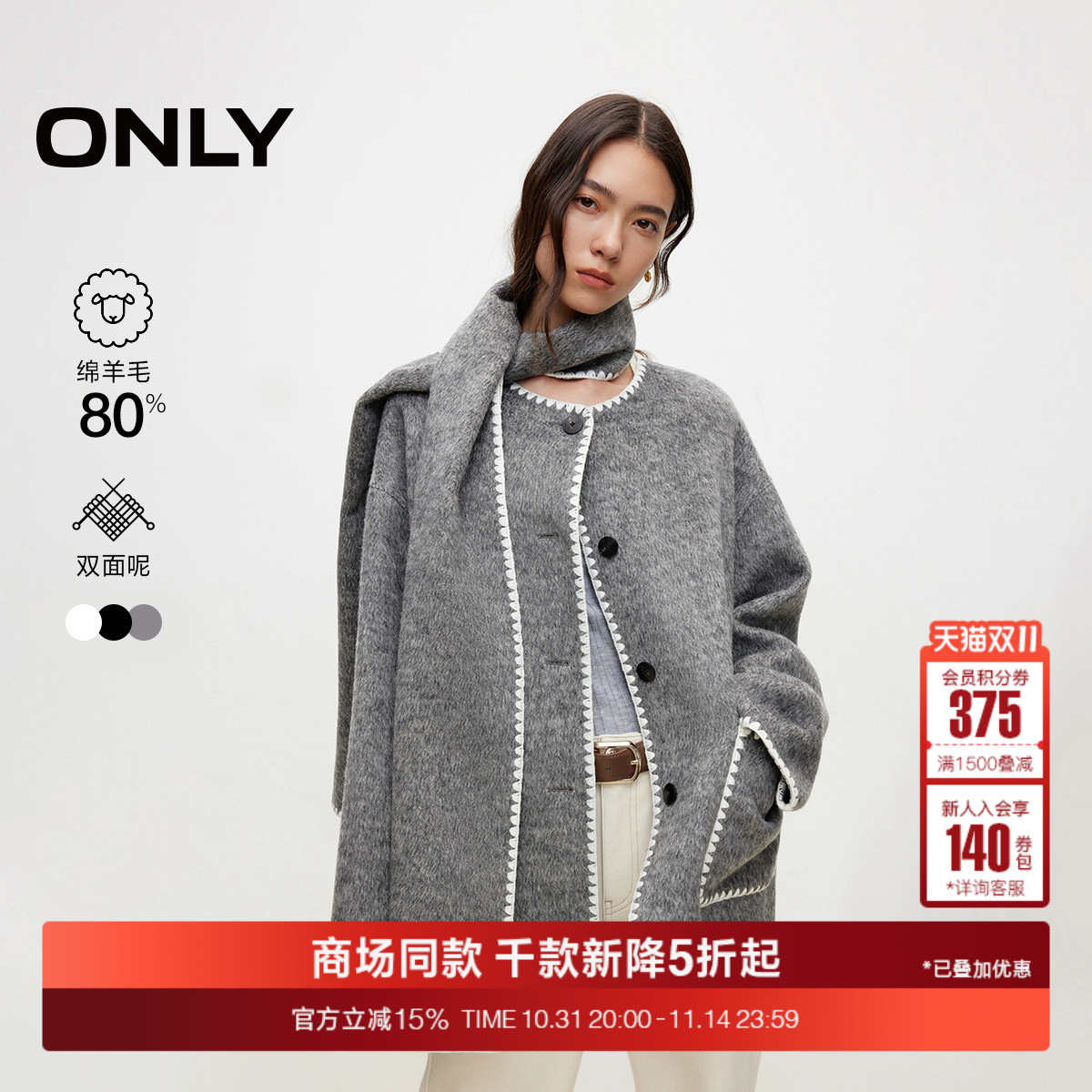 ONLY2025冬季新款撞色贝壳绣边落肩宽松含绵羊毛双面呢毛呢大衣女