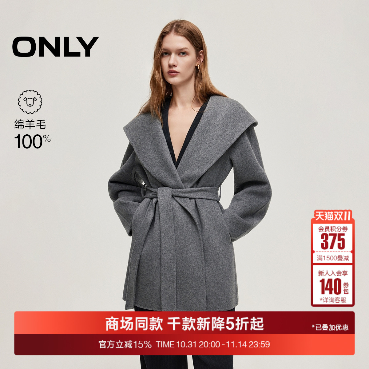 ONLY2025冬季新款100%绵羊毛双面呢无扣开襟设计连帽毛呢大衣女
