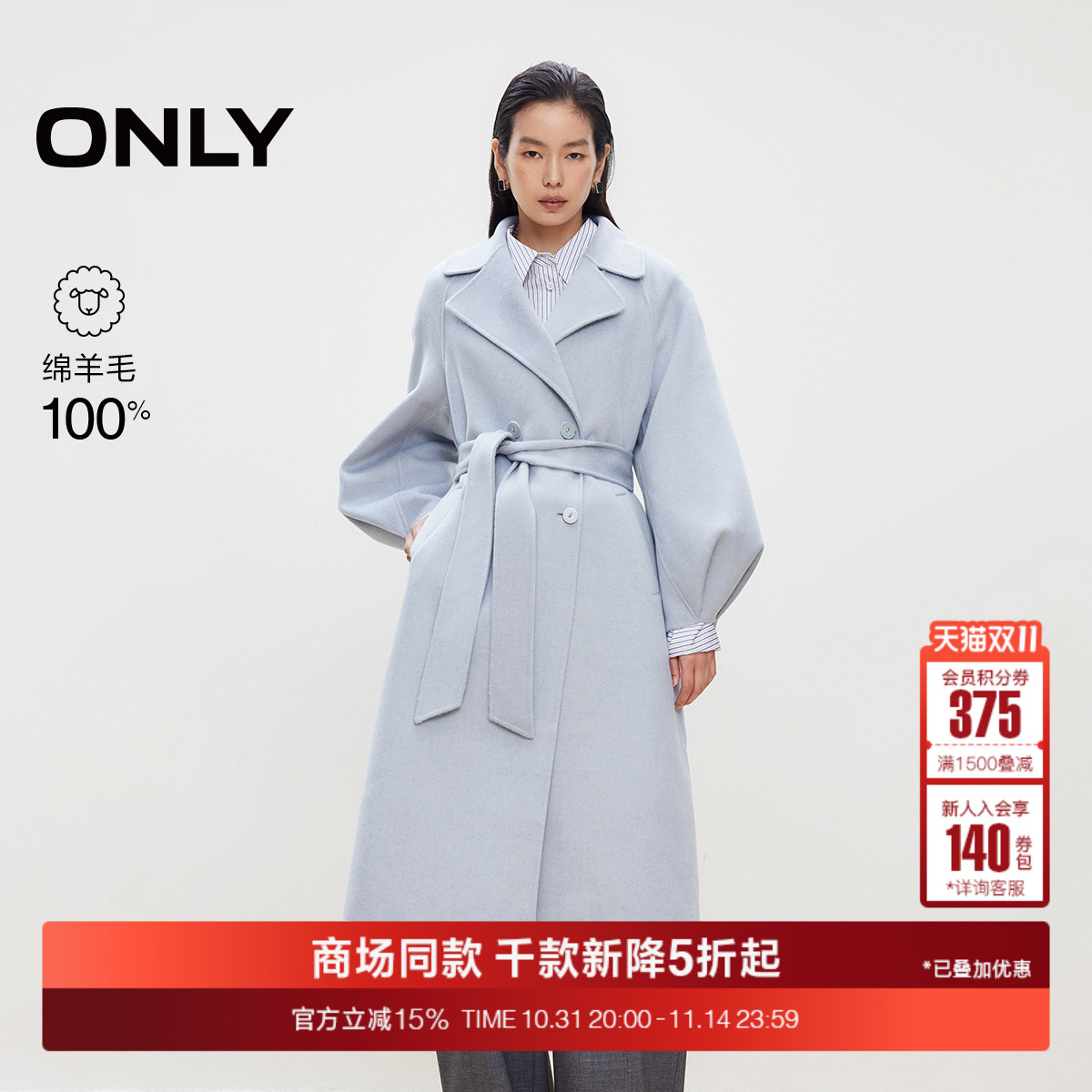 ONLY2025冬季新款100%绵羊毛双面呢纯色睡袍式系带长款毛呢大衣女