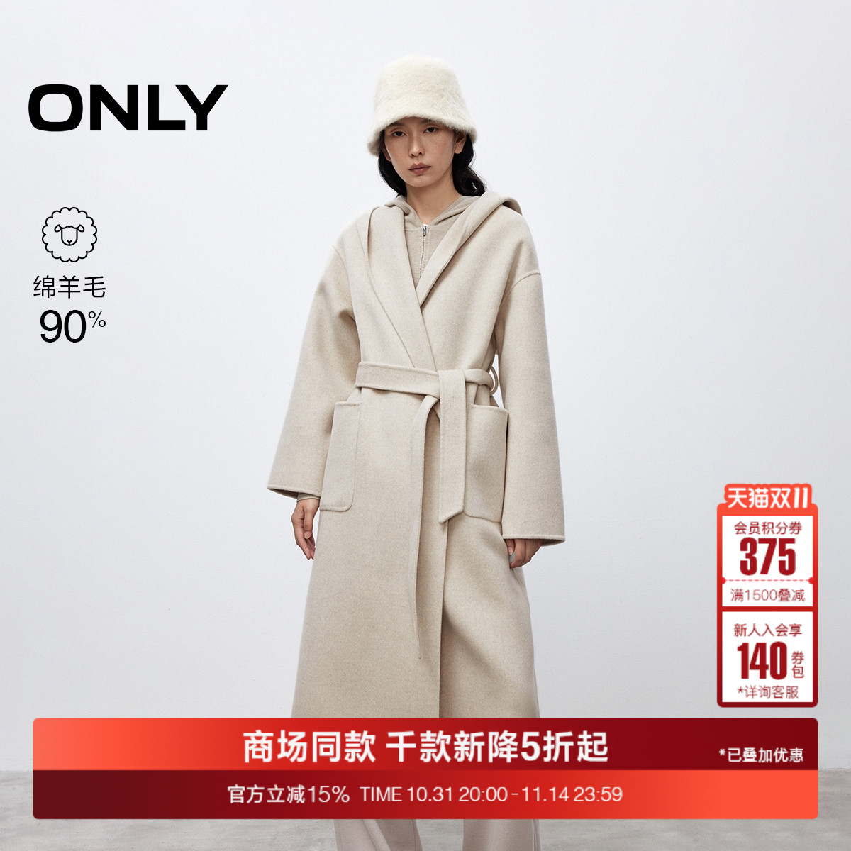 o区绫致ONLY秋冬新款含绵羊毛气质连帽长款毛呢大衣女时尚潮