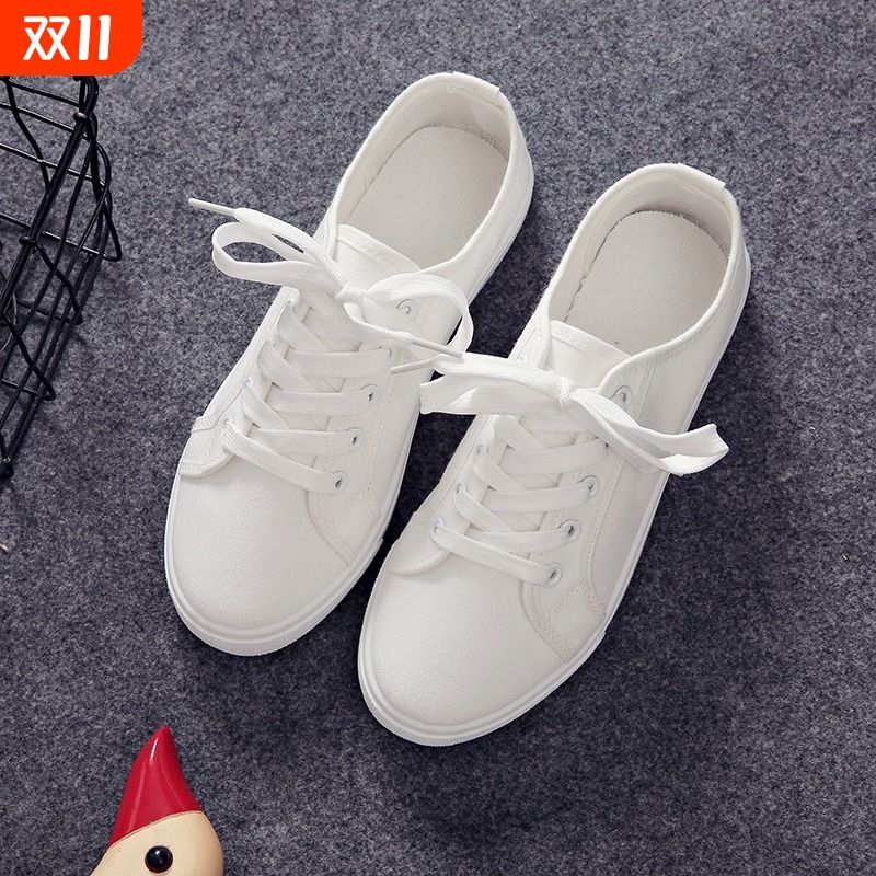 秋拖鞋帆布鞋韩版女半拖无后跟小白鞋男鞋平跟懒人情侣鞋平底凉鞋
