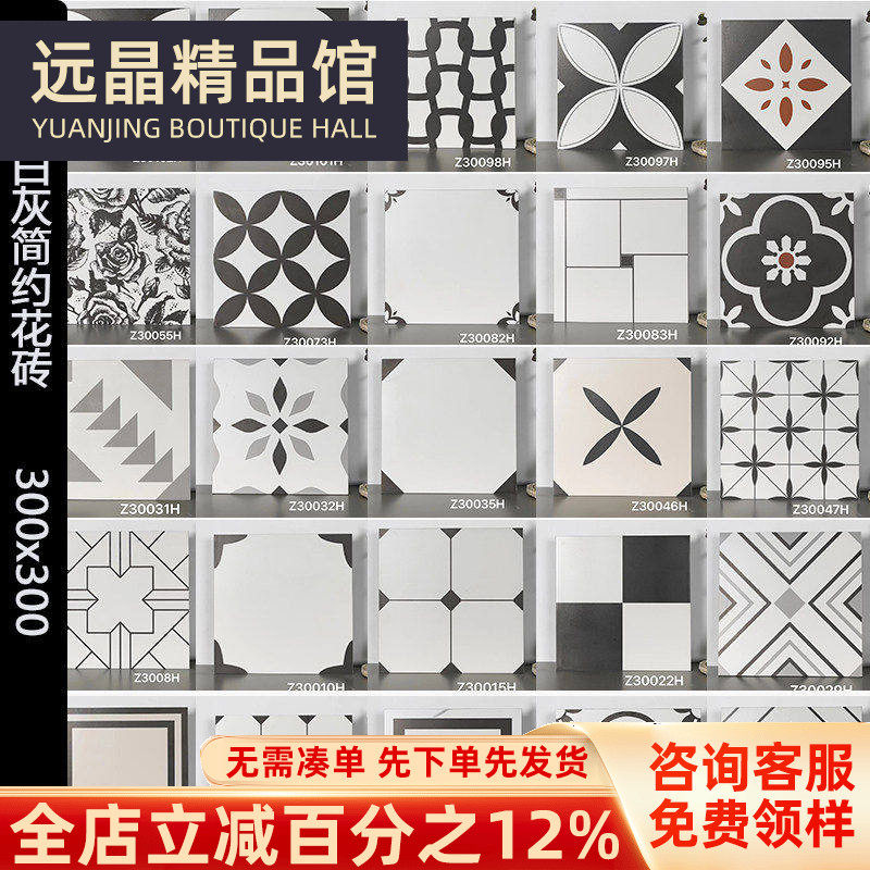 北欧瓷砖厨房卫生间黑白灰花砖300x300厨卫墙砖阳台砖防滑地板砖