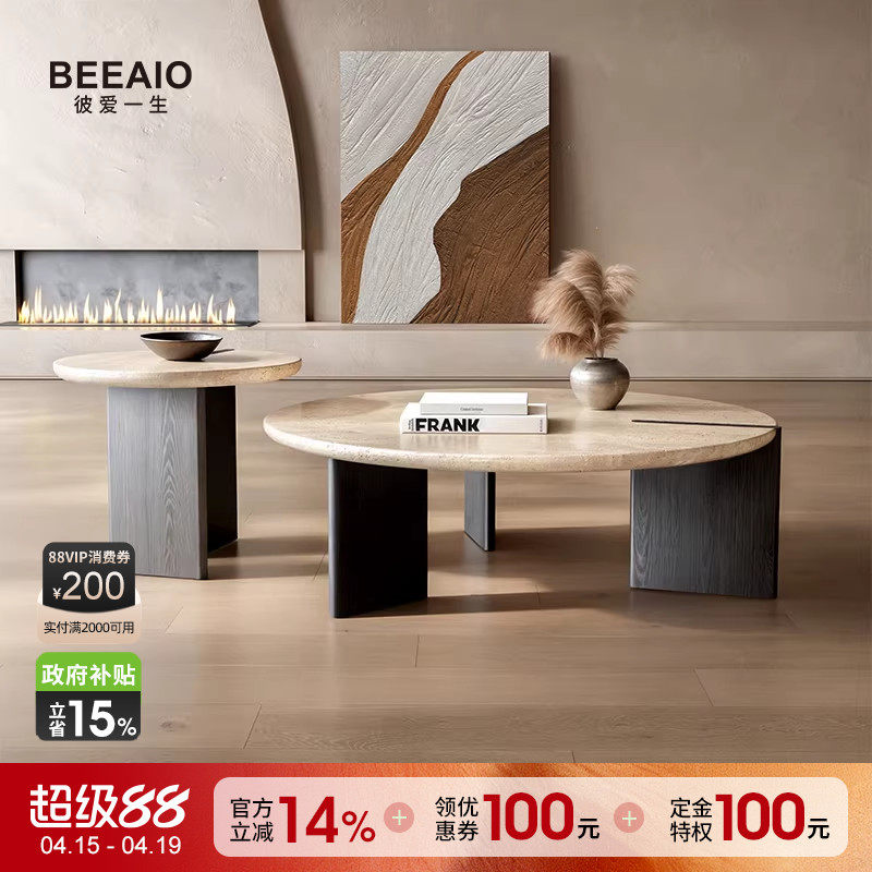 纯天然洞石茶几客厅家用中古风实木大理石茶几设计师高级感圆茶几