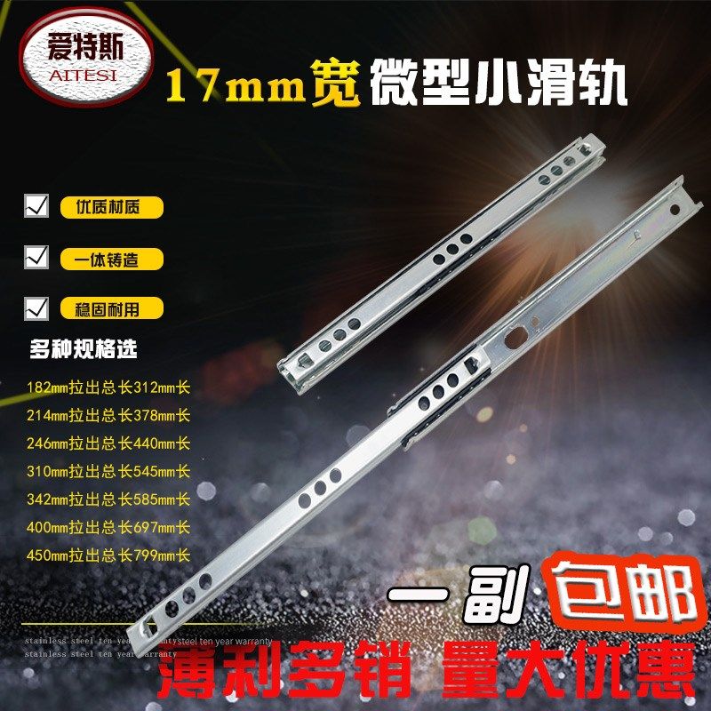 17mm宽2节双向托底滑轨极窄迷你D滑道窄型导轨橱柜抽中抽屉小滑轨