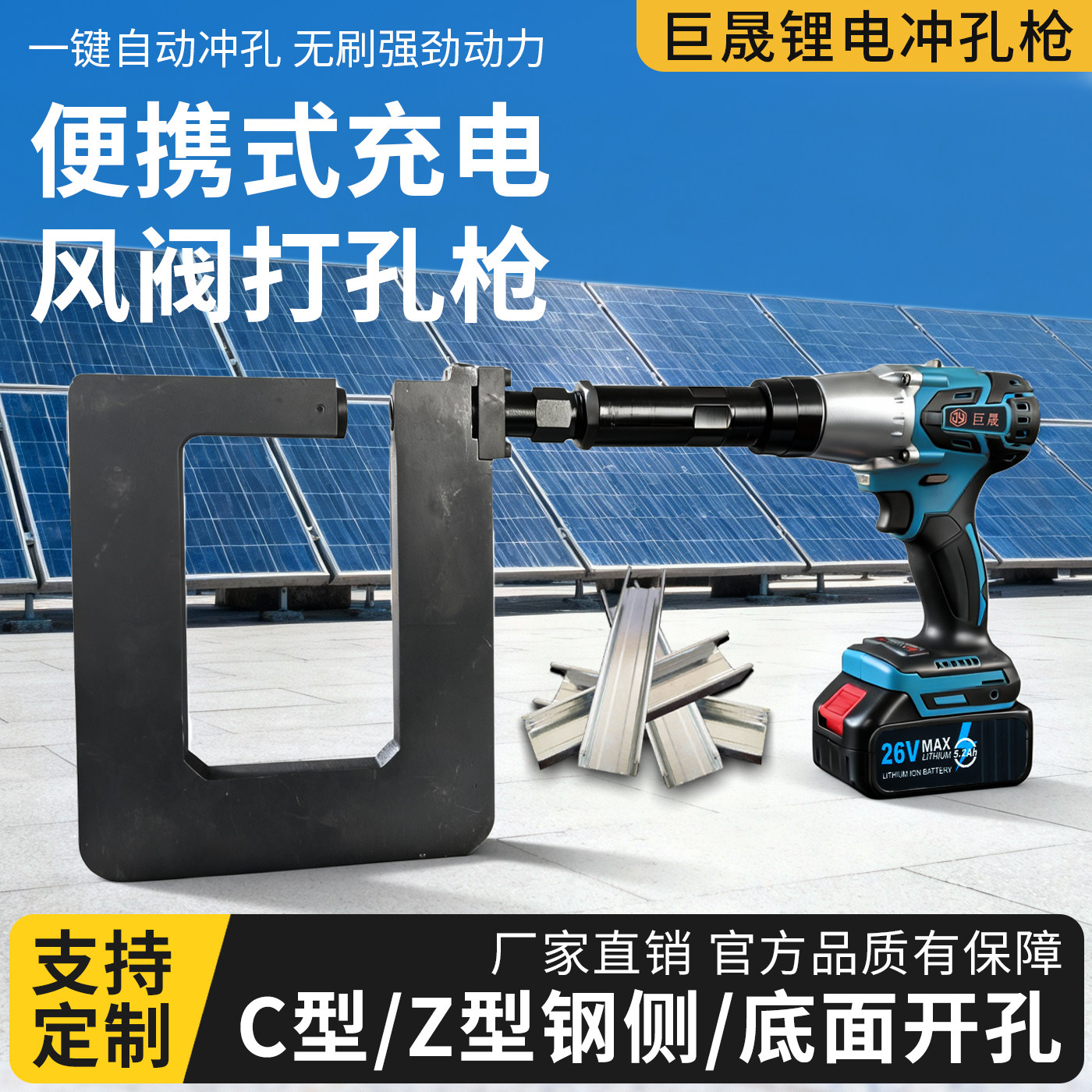 巨晟便携手持式充电光伏支架锂电开孔器C型Z型钢打孔枪檩条冲孔机