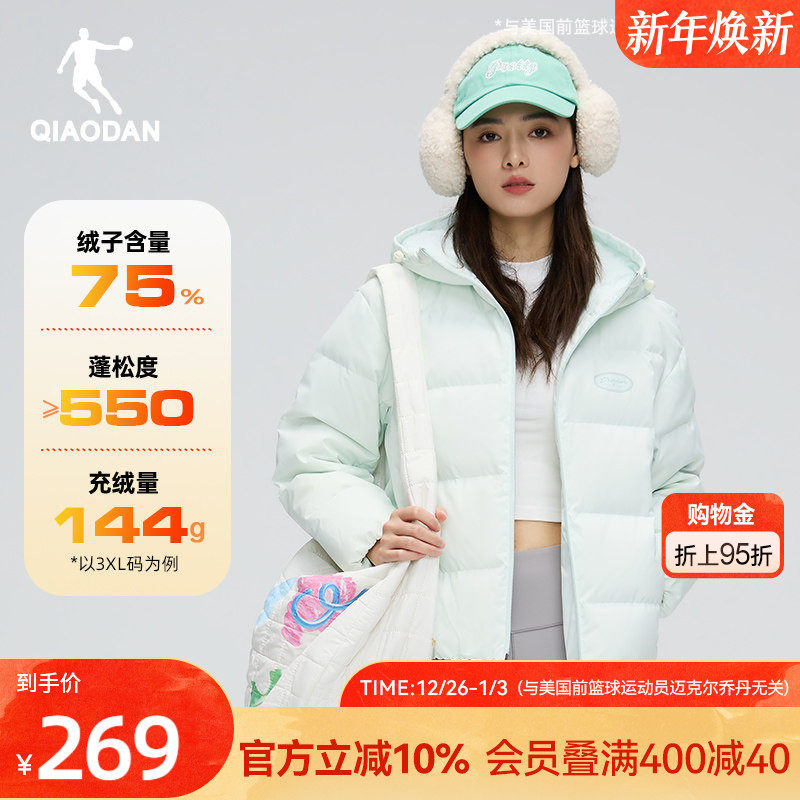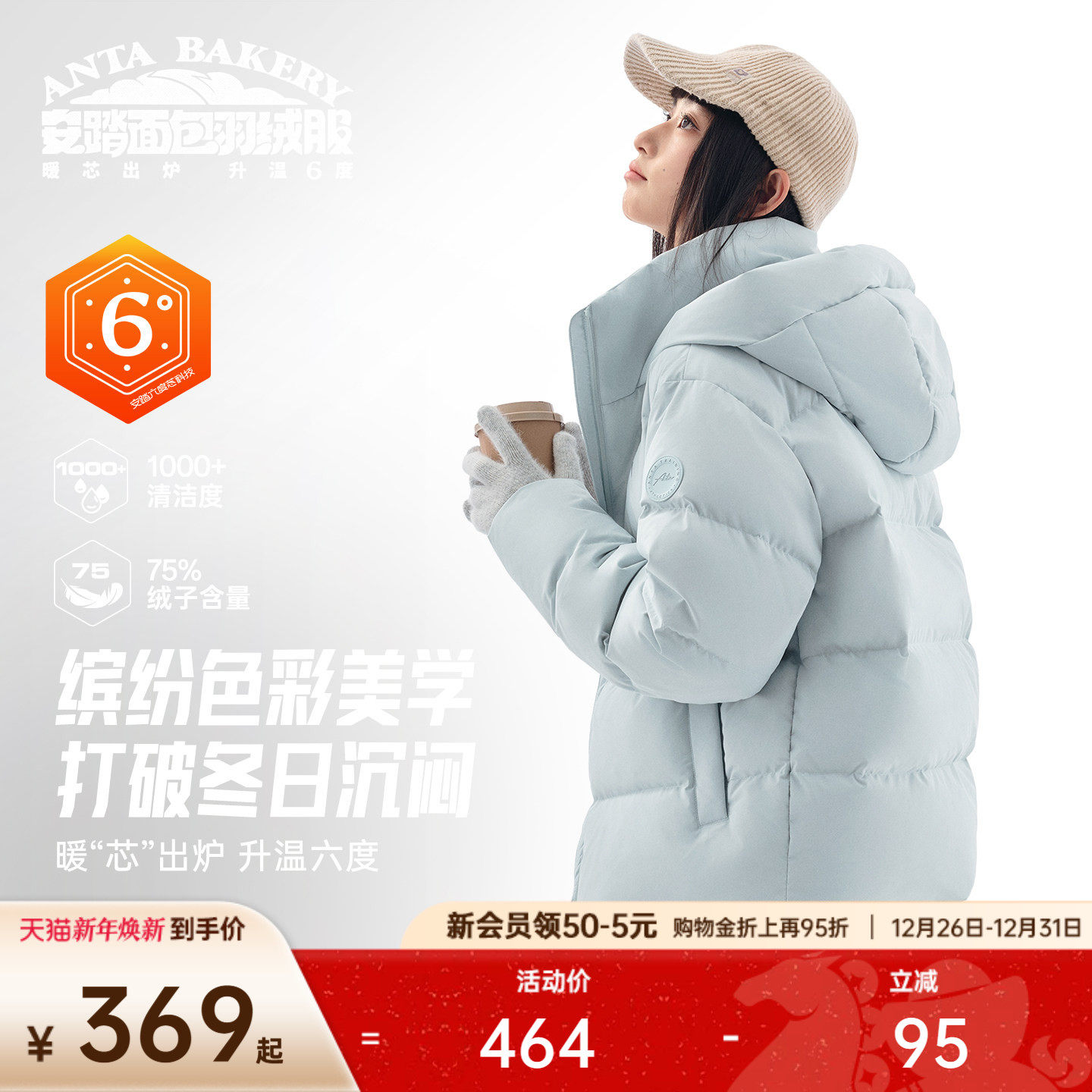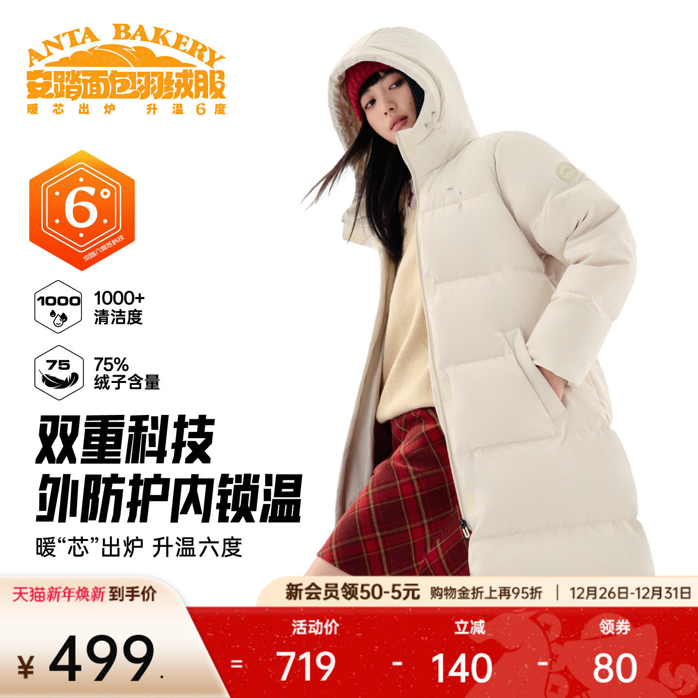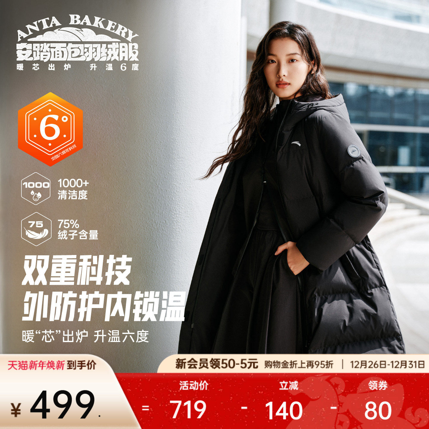 安踏面包羽绒丨中长款连帽羽绒服女士2025冬季防泼水鸭绒保暖外套