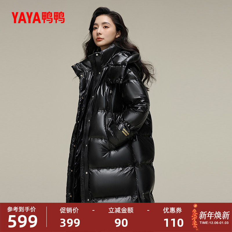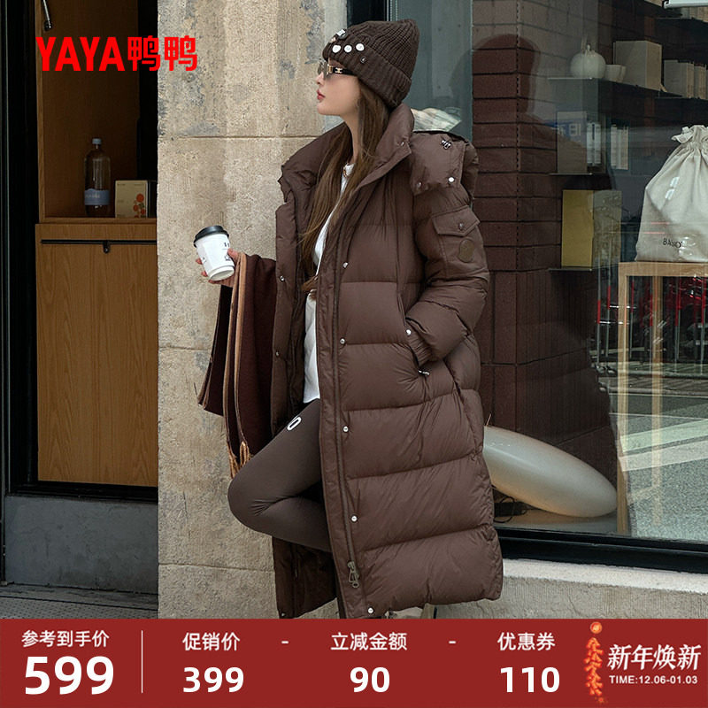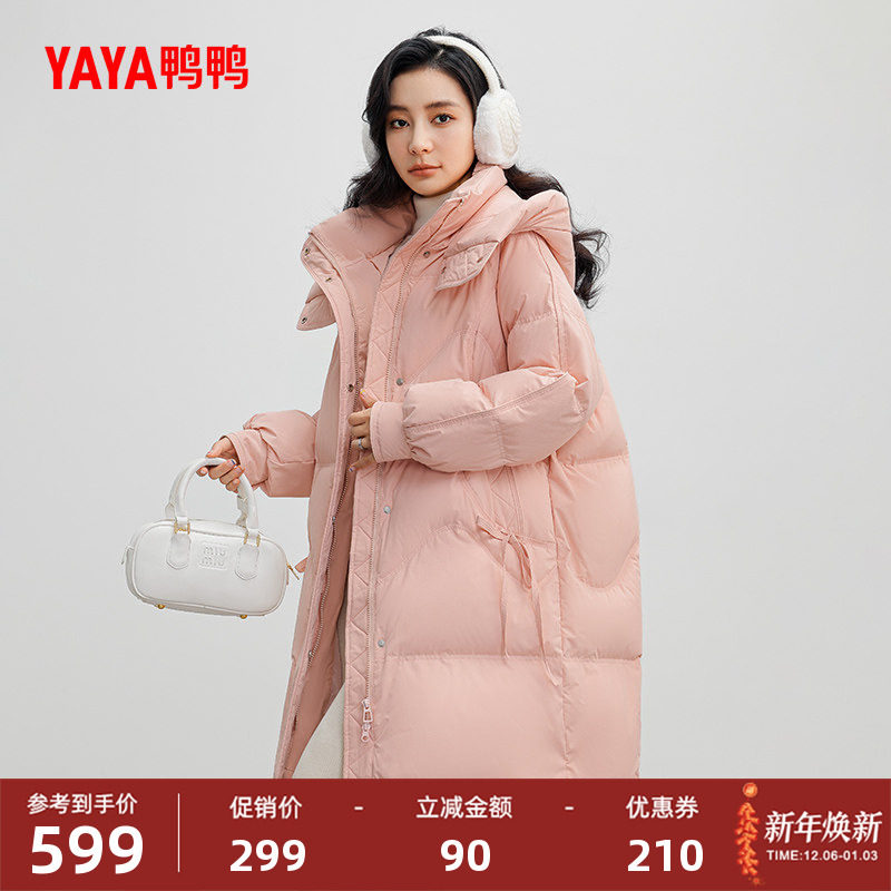 鸭鸭羽绒服女士2025冬季新品长款过膝连帽保暖90绒潮流加厚外套S