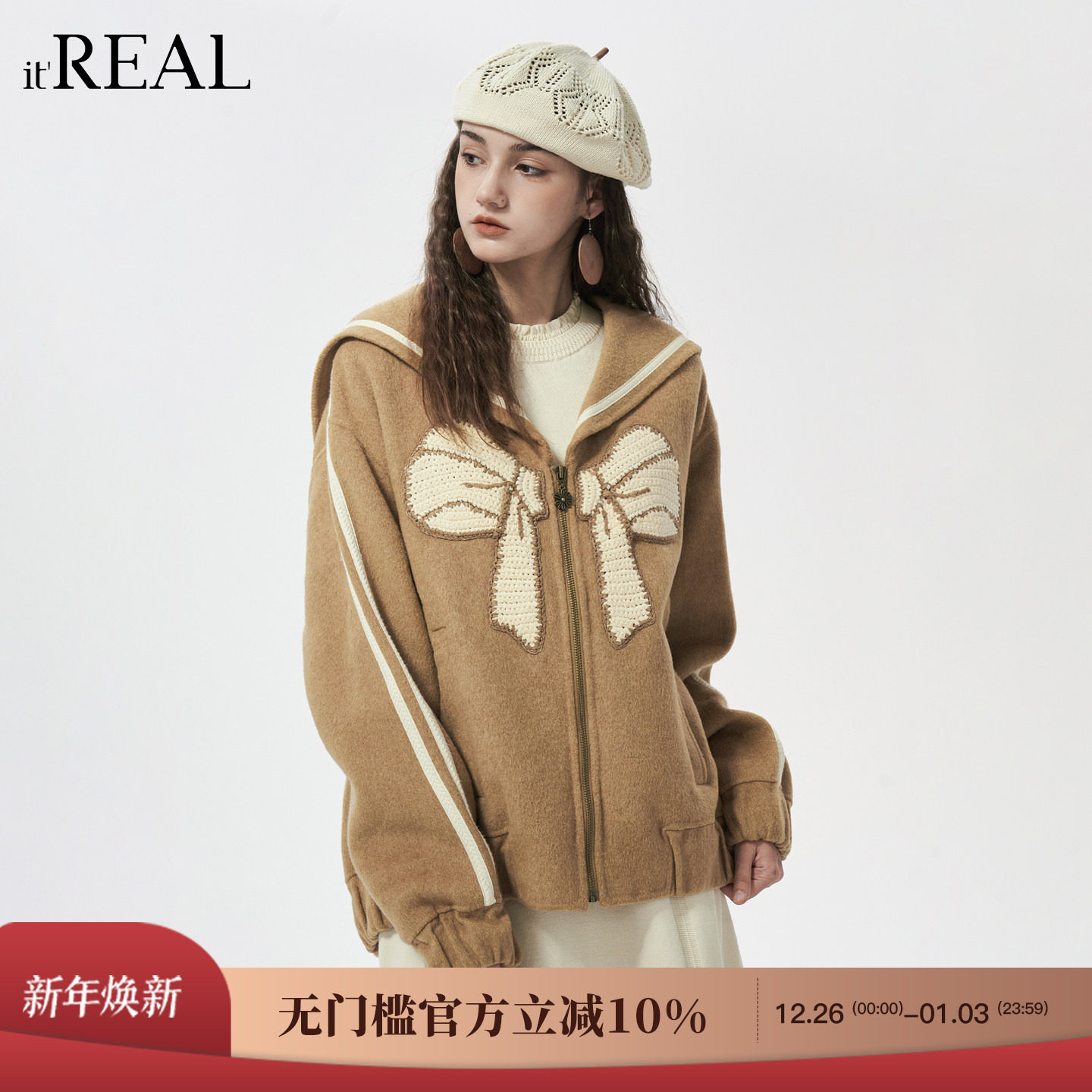 it'real瑞尔冬季新款复古加厚保暖蝴蝶短款呢大衣外套上衣女