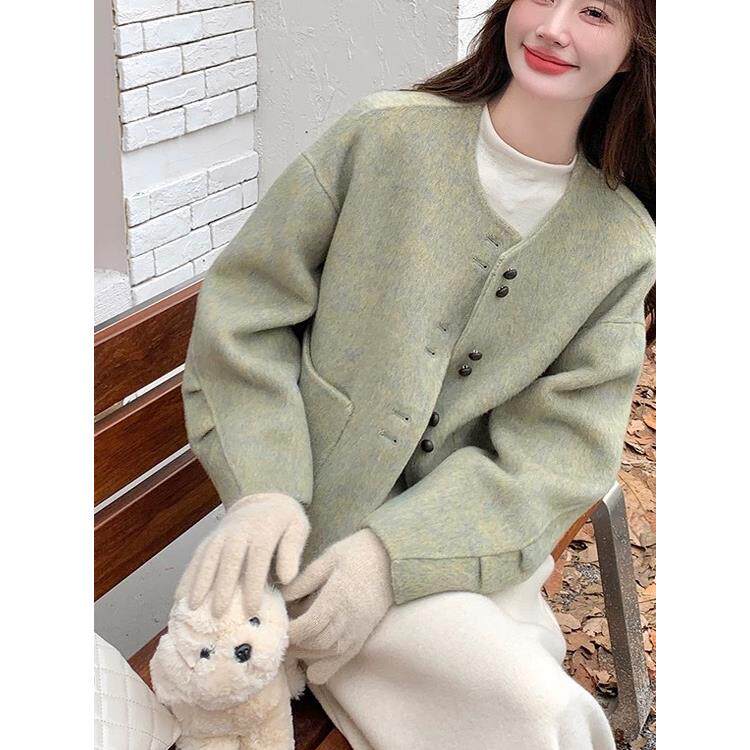 小香风绿色单面呢小个子外套女秋冬短款呢大衣高级感韩系爆款气质