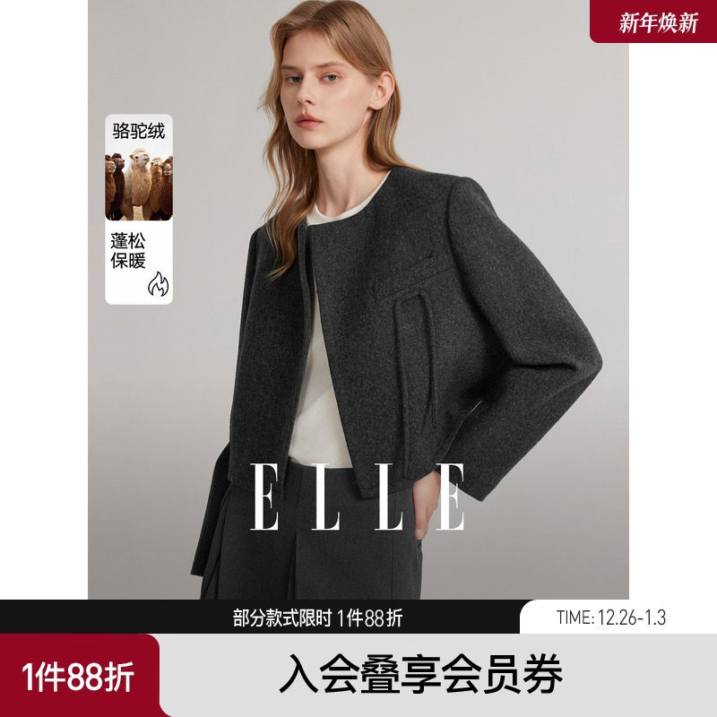 【商场同款】ELLE新中式骆驼绒短款呢大衣女2025冬季新款优雅外套