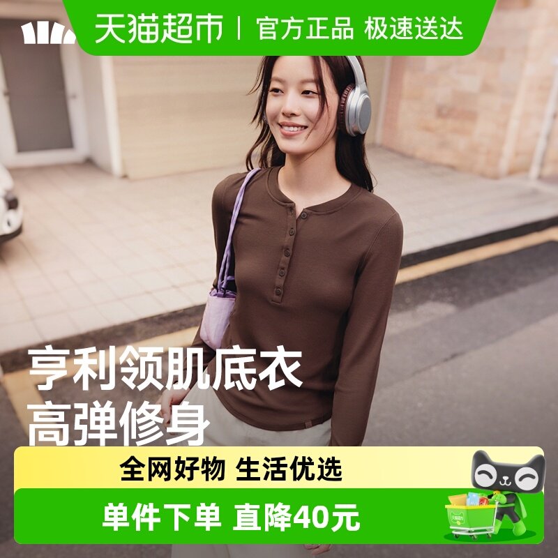 女士螺纹亨利领T恤衫 圆领弹力修身长袖打底衫 内搭 春秋款 女装