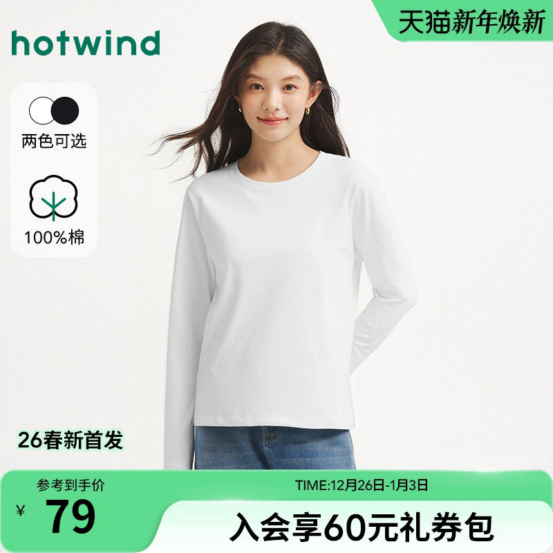 热风女士白色长袖T恤上衣2026年春季新款基础简约百搭长袖打底衫