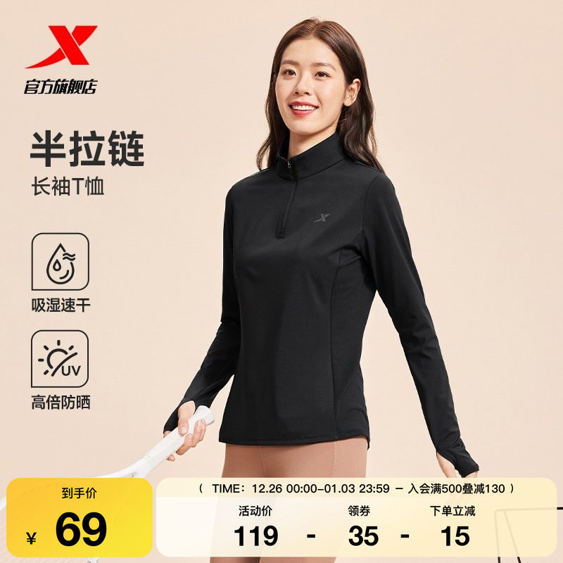 特步半拉链打底长袖T恤女士2025年秋季新款t恤女款套头衫运动上衣