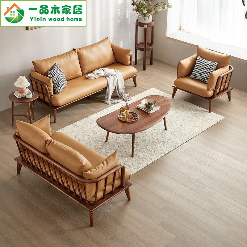 北美黑胡桃木实木沙发真皮北欧轻奢侘寂风小户型客厅家具原木沙发