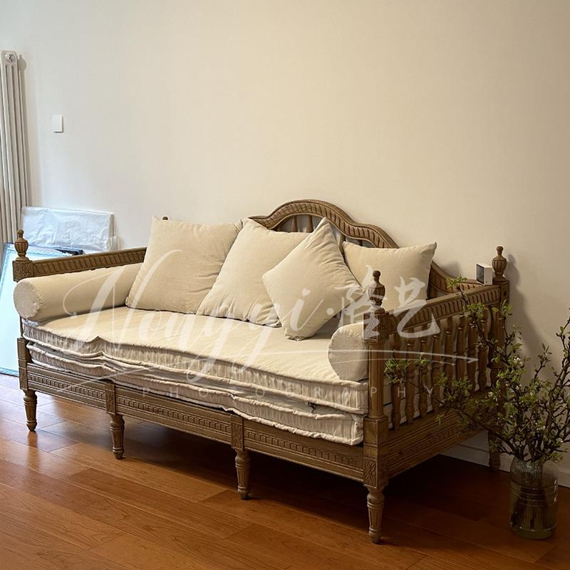 需定制美式高端实木复古做旧三人沙发法式简约小户型原木沙发床可