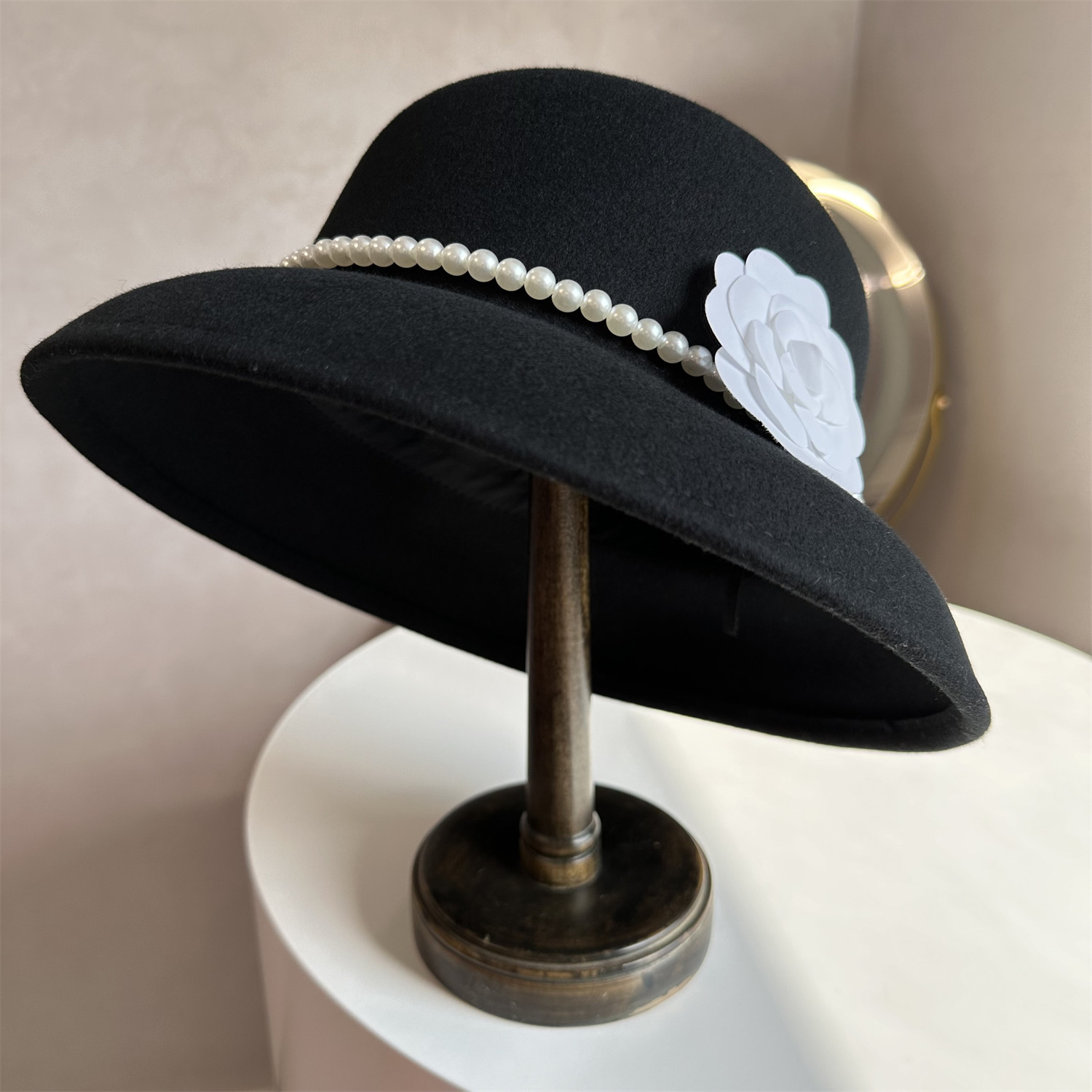 赫本风珍珠羊毛呢礼帽女英伦复古时尚百搭圆顶帽女秋冬复古大檐帽