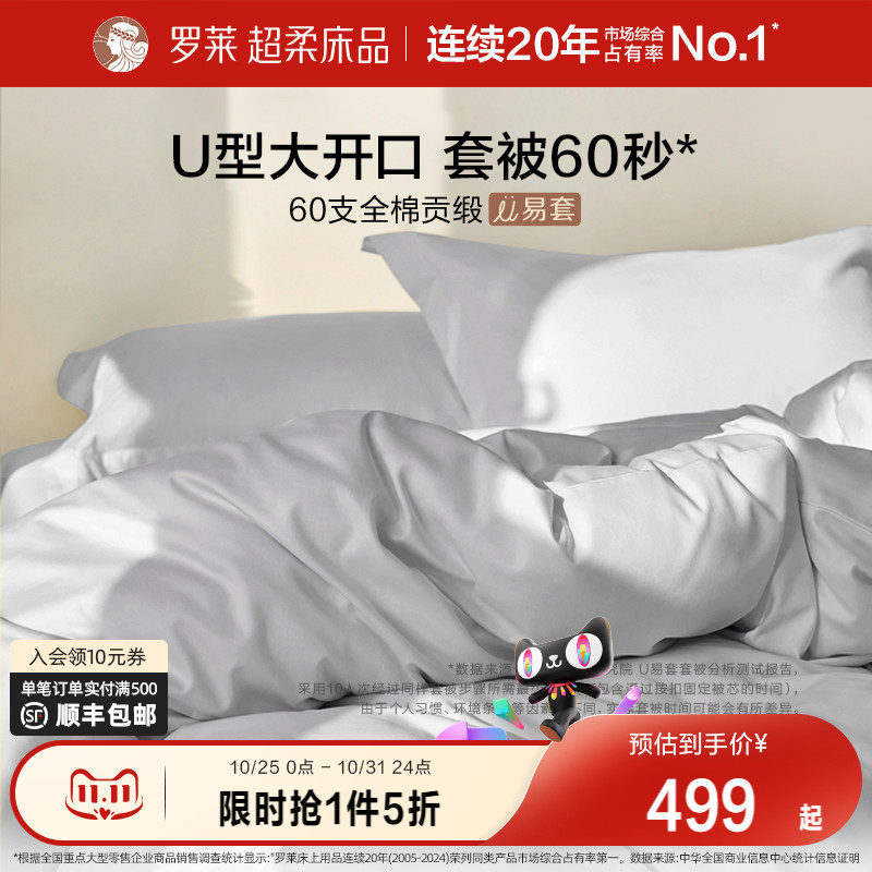 罗莱家纺官方60支贡缎四件套纯棉被套床品秋冬全棉超柔U易套套件