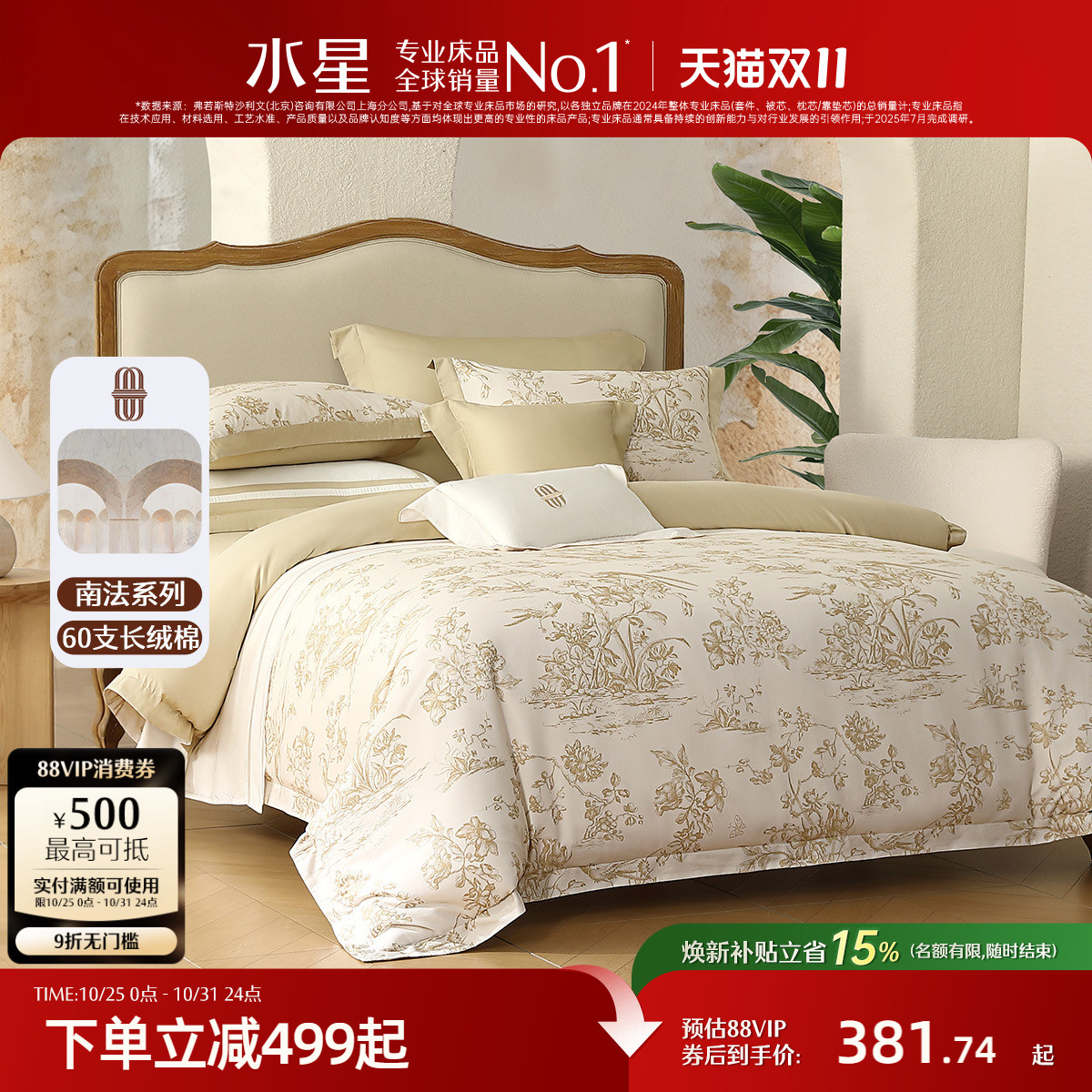 水星家纺60支长绒棉贡缎四件套A类抑菌轻奢套件法式印花被套床单