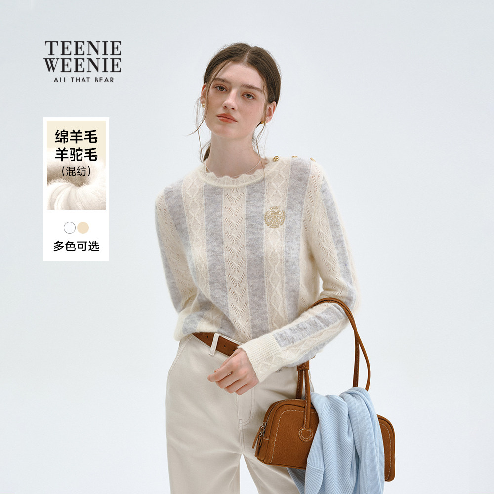 TeenieWeenie小熊女装毛针织衫2025冬新款竖条纹肌理感圆领毛衣