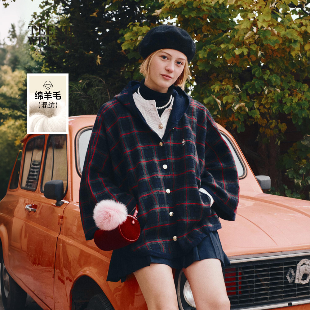 TeenieWeenie小熊女装毛针织衫25冬季新款复古格纹斗篷式连帽开衫