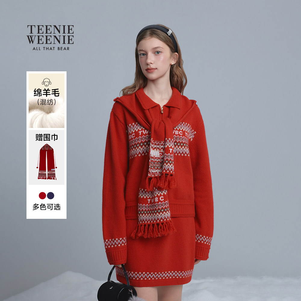 TeenieWeenie小熊女装毛针织衫25冬季新款可拆卸帽子围巾提花开衫