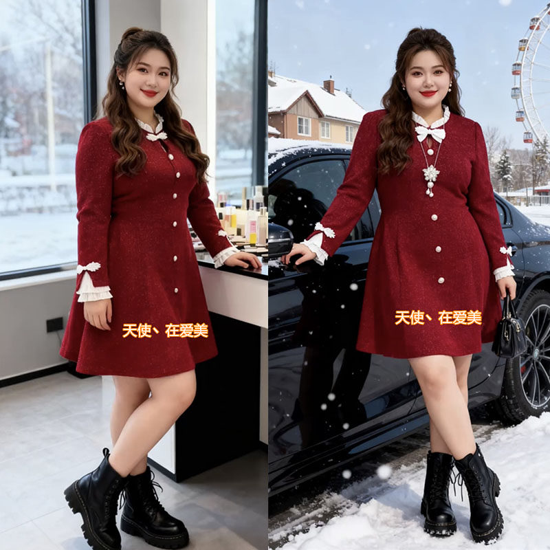 胖妹妹秋冬新款大码女装时尚气质复古盘扣木耳拼接显瘦别致连衣裙
