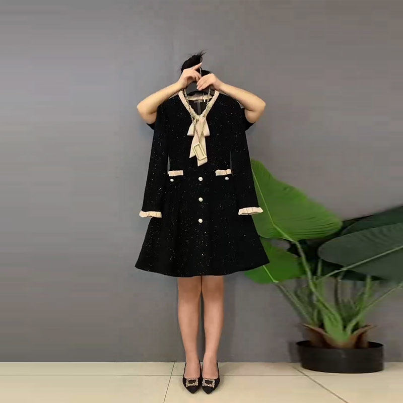 胖妹妹圆领亮片肩七分袖连衣裙大码女装法式赫本风秋冬款显瘦裙子
