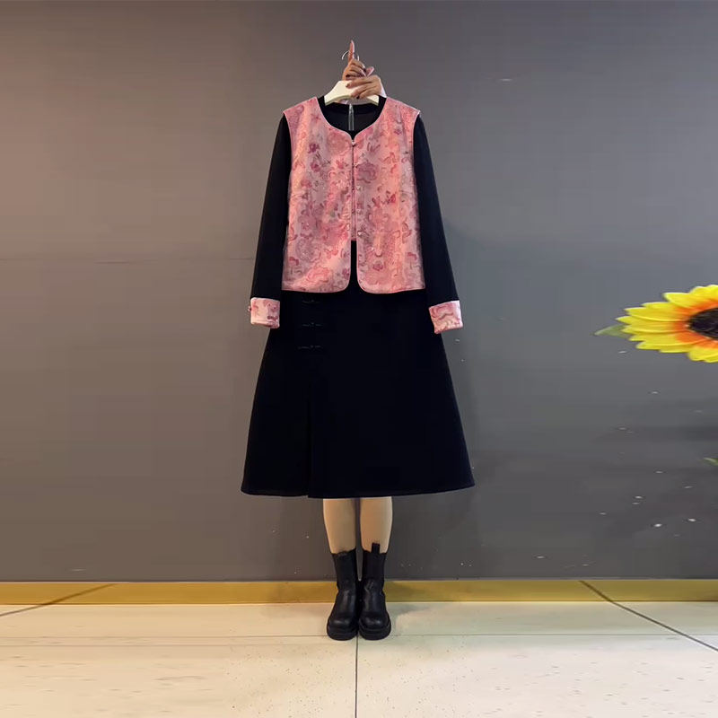 加大码女装花纹马甲拼色袖口连衣裙胖妹妹复古风显瘦秋冬款两件套