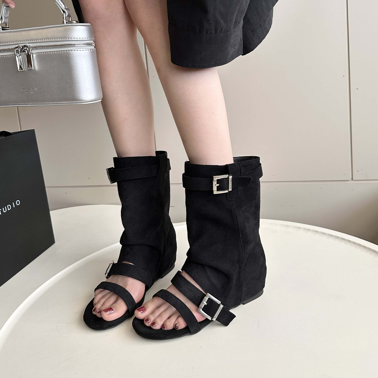 复古罗马套趾凉靴女2026年夏季新款坡跟高帮凉鞋内增高后拉链短靴