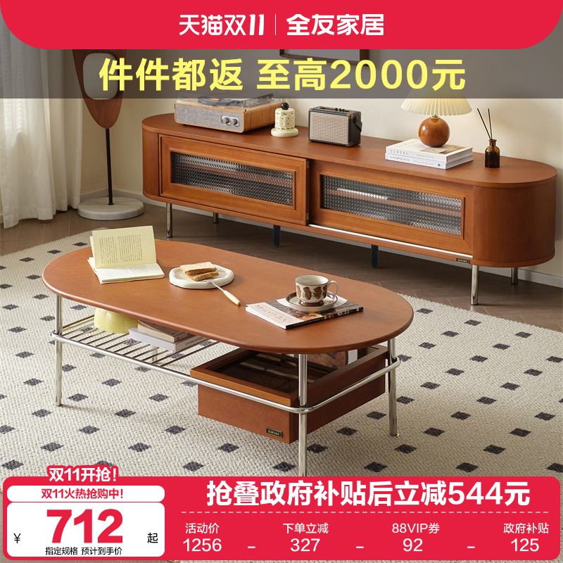 全友家居2025新款客厅家用中古风家具椭圆形储物电视机柜茶几组合