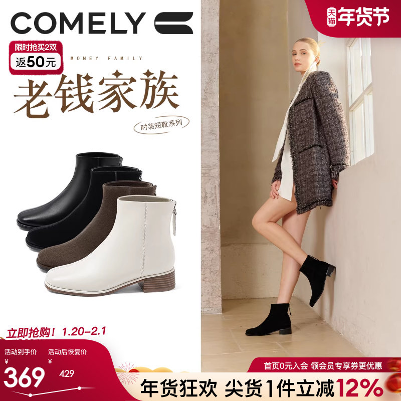 康莉真皮短靴女冬季新款法式羊皮粗跟百搭棕色靴子白色显瘦时装靴