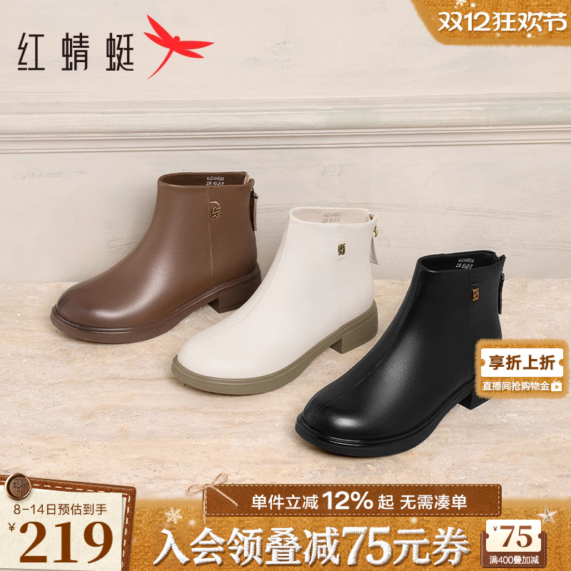 红蜻蜓真皮白色短靴女冬季新款女鞋皮靴复古英伦风皮鞋女时装靴子