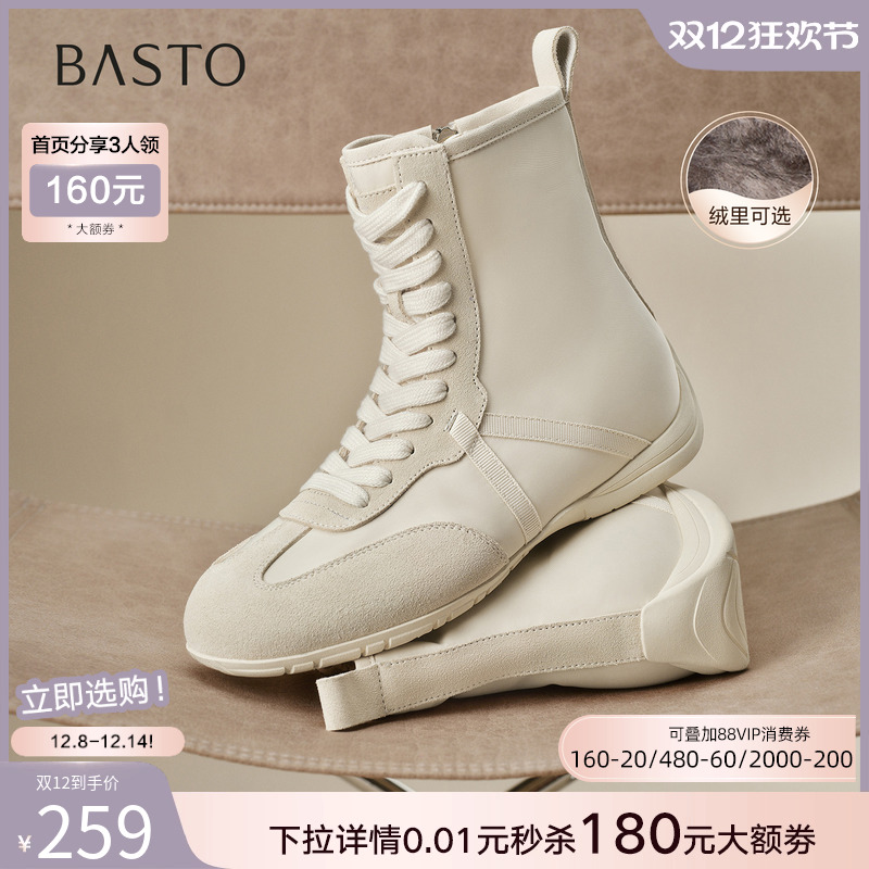 百思图25冬新款德训运动短靴拳击靴真皮加绒白色马丁靴女A8727DD5