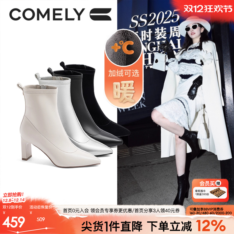 佘诗曼同款新闻女王康莉高跟白色短靴女冬新款真皮粗跟尖头瘦瘦靴