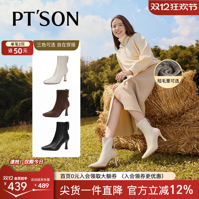 红蜻蜓高跟鞋2025冬季新款女鞋靴子细跟短靴真皮白色尖头皮鞋女靴