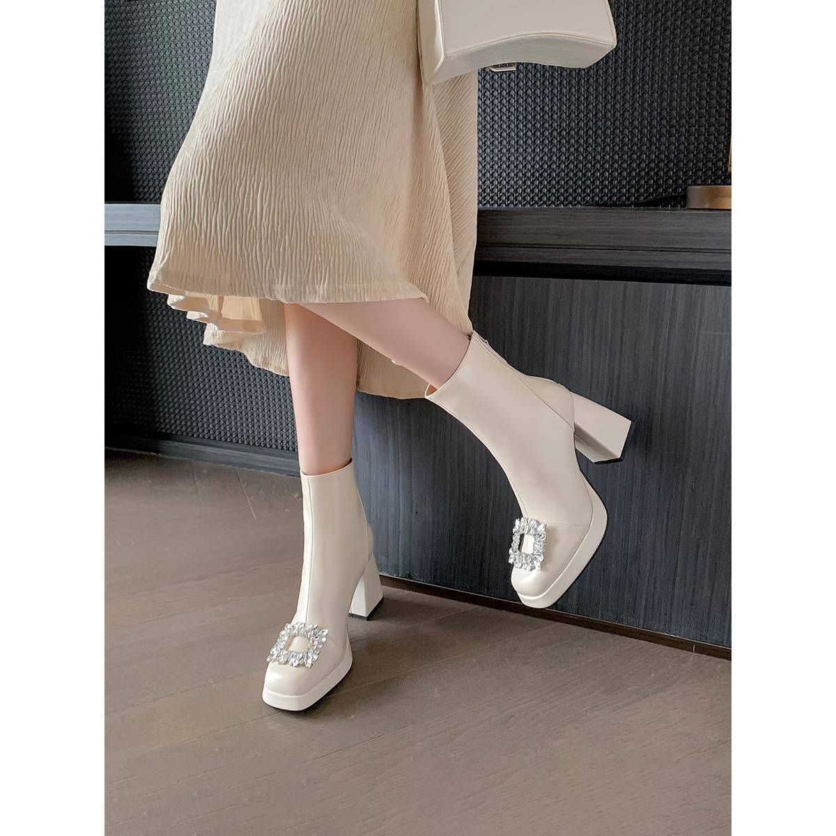 香港莱茵石女方扣靴2025春秋季厚底厚跟白色短靴真皮短管修身靴