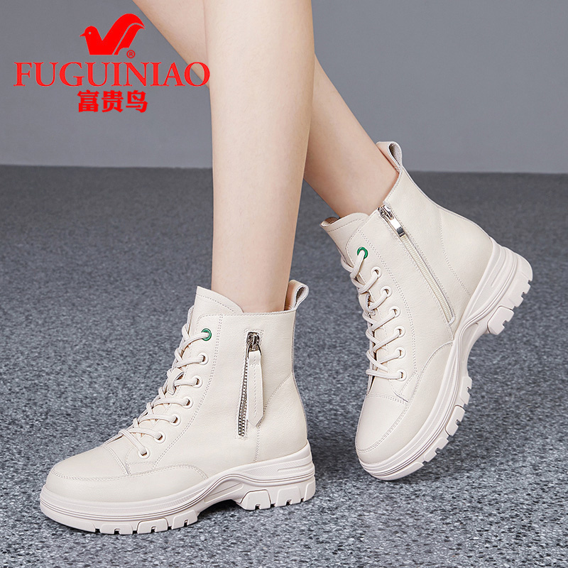 气质富贵鸟白色短靴真皮秋冬季新款靴子平底高跟马丁靴厚底瘦瘦靴